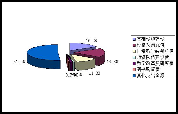 2016年全校办学经费总支出为4921.78万元,其中,基础设施803.21万元,占16.3%;日常教学经费556.5万元,占11.3%;设备采购922.64万元,占18.8%;教学改革及研究51.21万元,占1.0%;师资建设45.82万元,占0.9%;图书购置35.7万元,占0.7% ;其他支出(人员及学校正常运行经费)2506.7万元,占51%。学校办经费支出情况如图 6-2所示。
