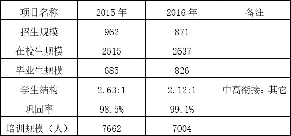2016年学校招收初中毕业生871 人,中职在校生为2637人,在校生中相关专业实现中高职衔接,其中实施中高职衔接1793人。2017届毕业生人数为826人,其中522人通过中高衔接进入专科层次学习。