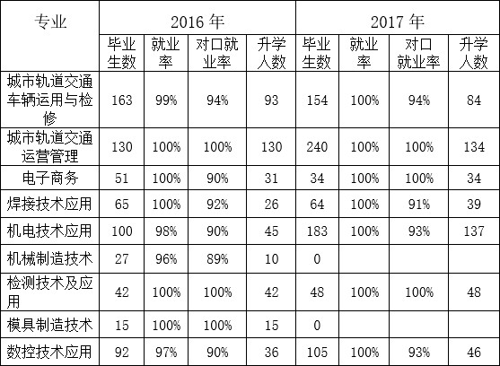 学校2017届中职毕业生总人数共计826名,所有毕业生均取得国家四级职业资格证书,其中522人通过中高职融通进入专科层次学习,294人进企业就业,10人参军,就业率100%,其中就业人数中有超过81.3%分布在长三角地区,学校2017届毕业生主要就业的行业集中在铁路机车车辆制造业、铁路运输服务业。本年度通过对用人单位的调研,用人单位的满意度达96%,比上学年增加0.9%。