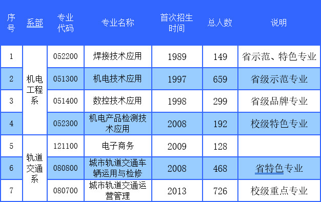 学校现设有轨道交通系、机电工程系、成人教育部等两系一部。开设城市轨道交通运营管理、城市轨道交通车辆运用与检修、机电技术应用、数控技术应用、焊接技术应用、电子商务等9个中职专业。其中省级品牌1个、特色专业2个,中央财政支持实训基地项目1个,省级示范实训基地3个。