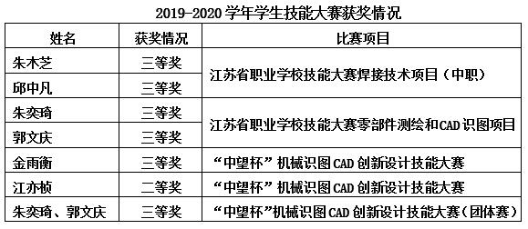 2019-2020学年,学校荣获常州市"龙城十佳双师型教师"和常州市优秀教育工作者各1人,荣获2019年度江苏省职业院校技能大赛优秀指导教师和江苏省职业院校技能大赛先进个人各1人,中国中车优秀共产党员和优秀党务工作者各1人。