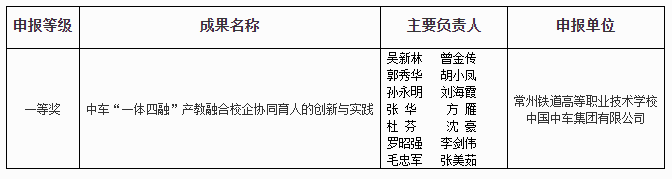 根据江苏省教育厅《关于做好2022年职业教育国家级教学成果奖申报推荐工作的通知》(苏教职函〔2022〕37号)文件精神和要求,拟推荐我校获2021年省级教学成果一等奖成果项目《中车“一体四融”产教融合校企协同育人的创新与实践》参与2022年国家级教学成果奖申报评选,现予以公示。