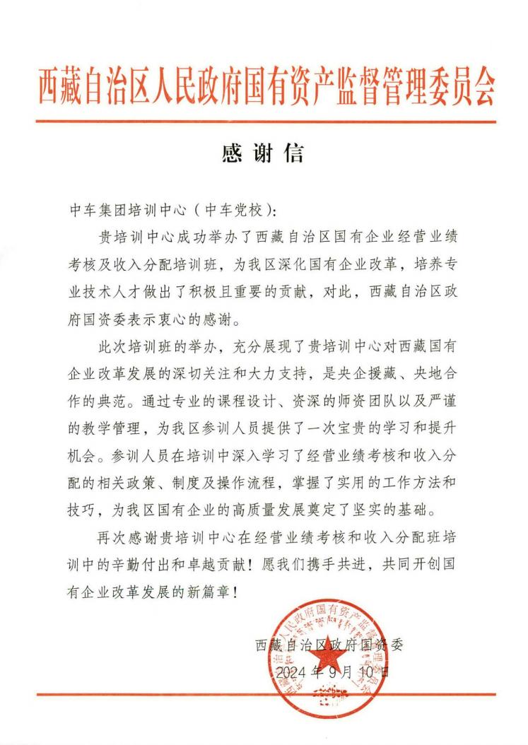 习近平在中央第七次西藏工作座谈会上强调,全面贯彻新时代党的治藏方略建设团结富裕文明和谐美丽的社会主义现代化新西藏。今年,正值对口支援西藏工作实施30周年。为深化西藏自治区国有企业经营业绩考核体系,学习借鉴中央企业先进的经营业绩考核和收入分配经验,不断提升区管国有企业业务人员政策应用能力,持续提高业绩考核、绩效评价和薪酬管理工作水平。西藏自治区国有企业经营业绩考核及收入分配培训班,于2024年8月27日至9月4日在中车党校成功举办。本次培训班在中车集团人力资源部和常州铁道高等职业技术学校的全力支持下,由中车学习培训发展中心参与项目方案策划、课程设计和各项服务对接工作, 取得良好成效,收到西藏国资委的好评,特此感谢信表示敬意。