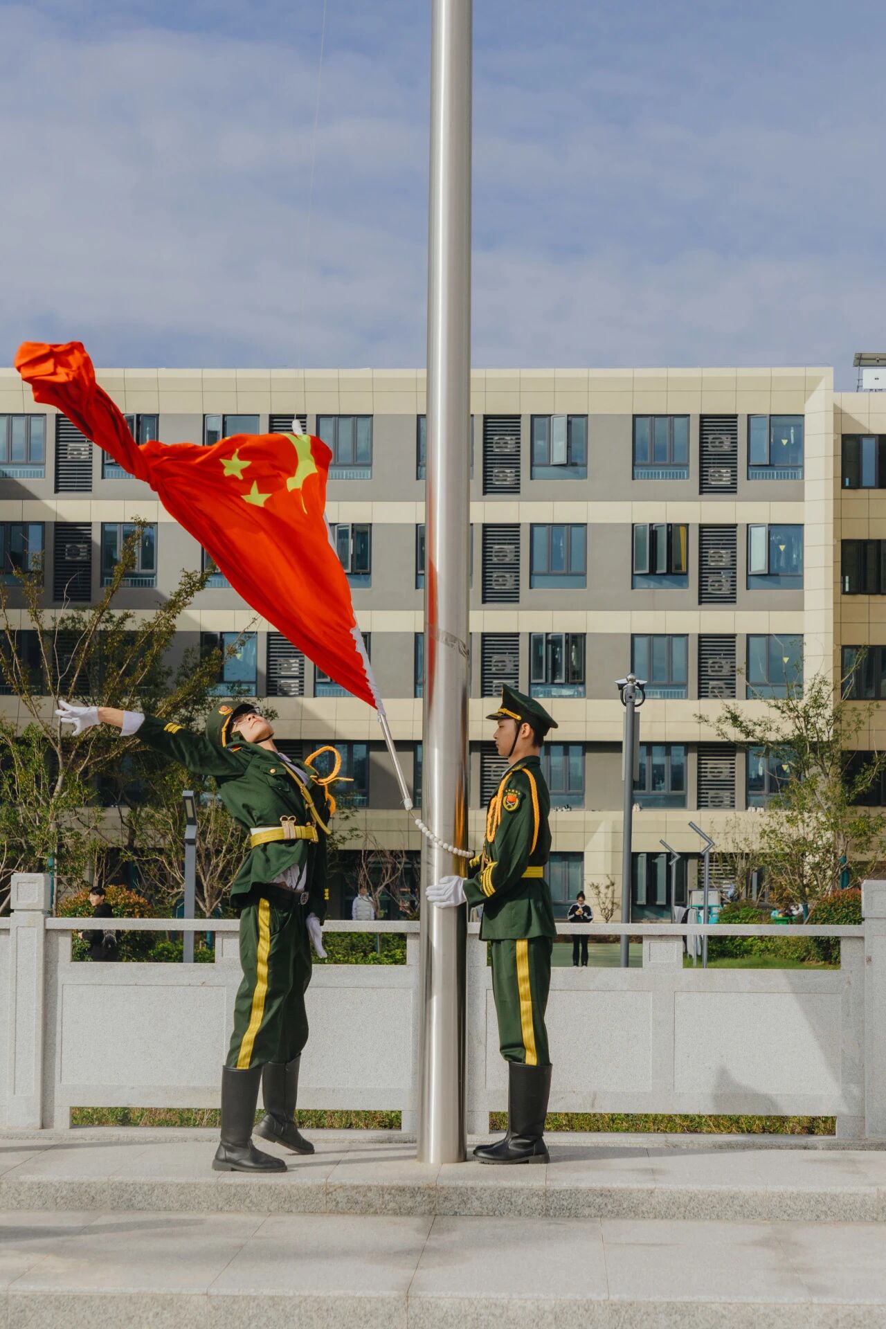 在雄壮的国歌声中,鲜艳的五星红旗冉冉升起,全体师生目光追随。运动会正式拉开序幕。