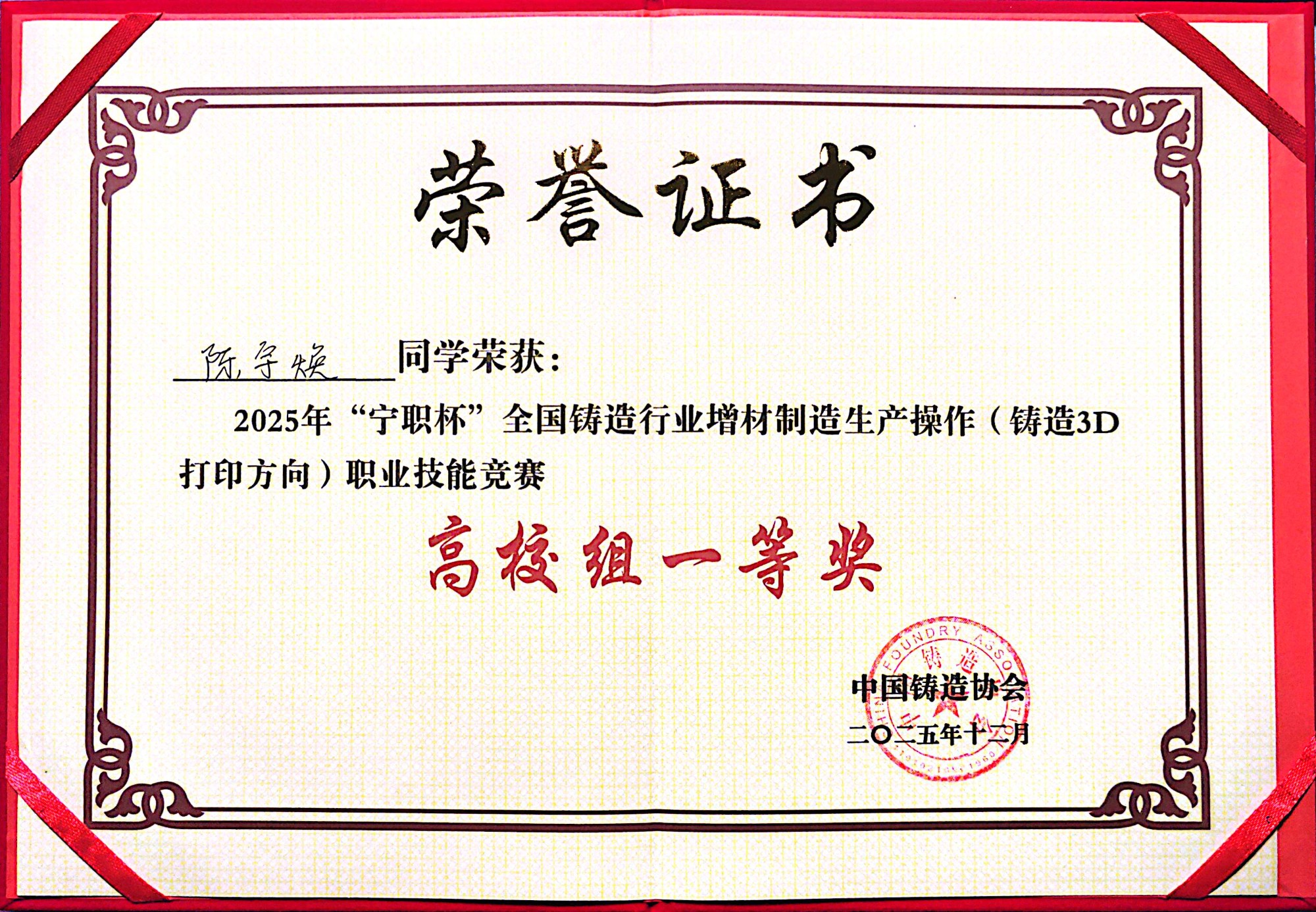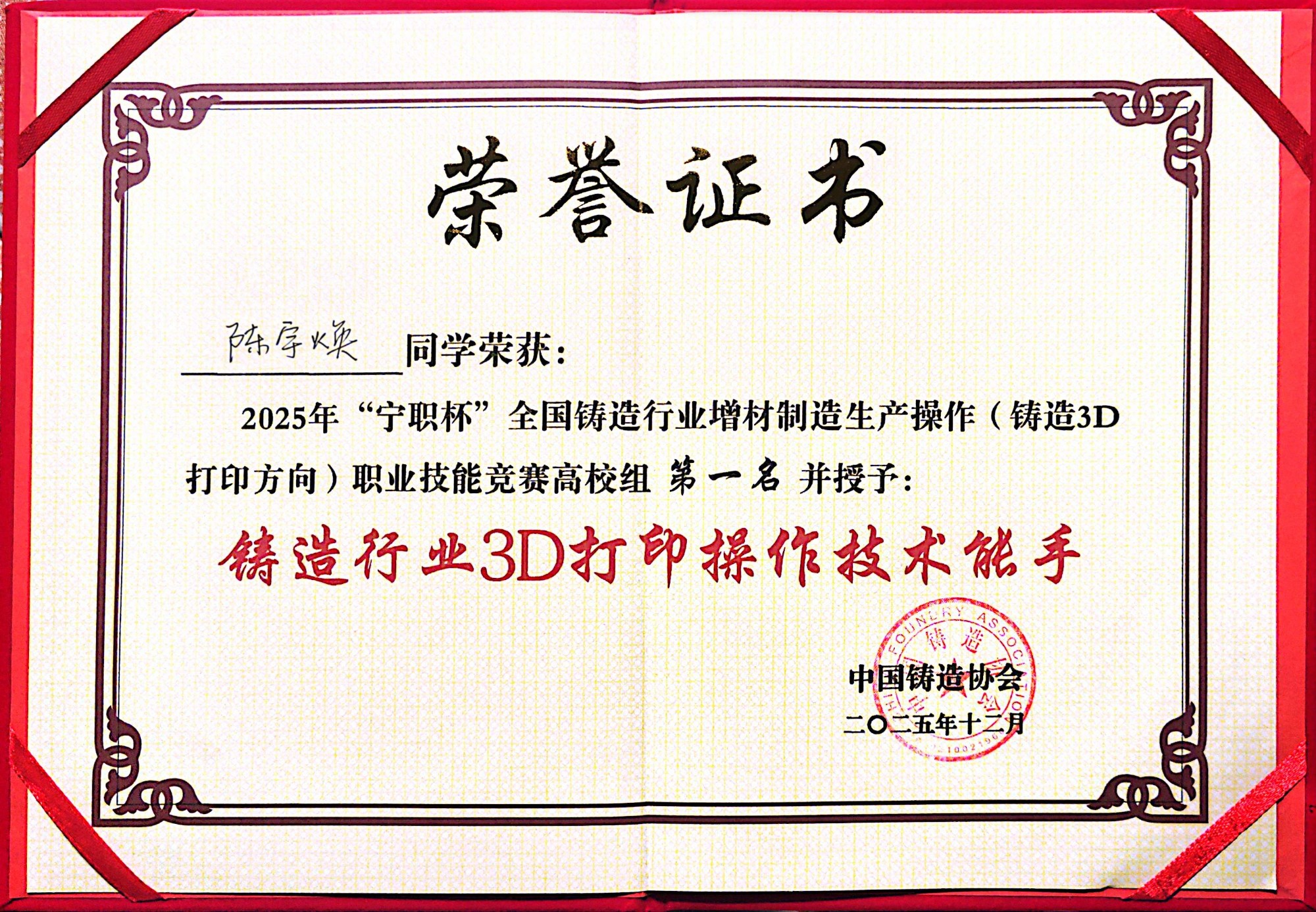 2025年“宁职杯”全国铸造行业增材制造生产操作职业技能竞赛圆满落幕,我校21级学生陈宇焕凭借扎实的专业技能与出色的实操能力,在全国高校组选手中脱颖而出,以总分第一的优异成绩斩获一等奖,并被授予全国“铸造行业3D打印操作技术能手”称号。这场荣誉的取得,不仅展现了学子的个人风采,更彰显了我校实践育人与产教融合的扎实成效。